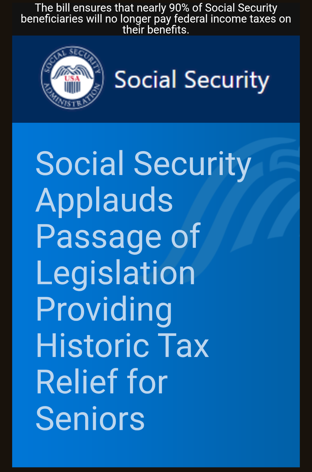 Social Security Applauds Passage of Legislation Providing Historic Tax Relief for Seniors