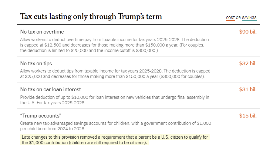 - TEMPORARY Senior “bonus” deduction that @devil mentioned. On the whole, probably a good thing, but I hate the fucking handout to Boomers. And because this is a big handout, it is going to be so painful when it expires in 2029 or whatever, making it a huge political bargaining chip.