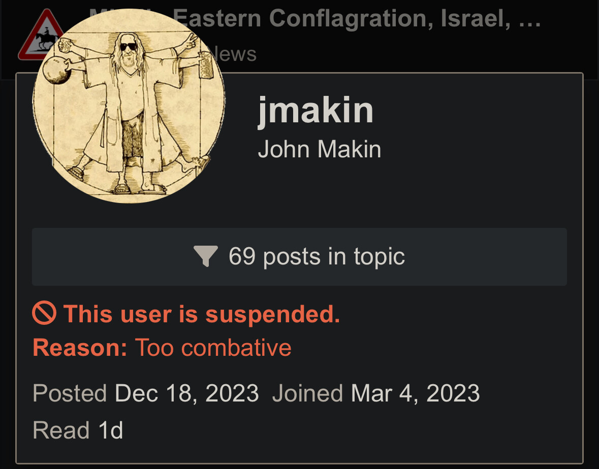 ban log says āthreat.ā I didnāt see any threats. sounds like classic ikes to me. troll and post high volume bad faith takes, bait someone into acting out, then go cry to mods who play along. wichita is a good poster. ikes is not. not only is he not, he has no desire to be (at least here). it isnāt more complicated than that.