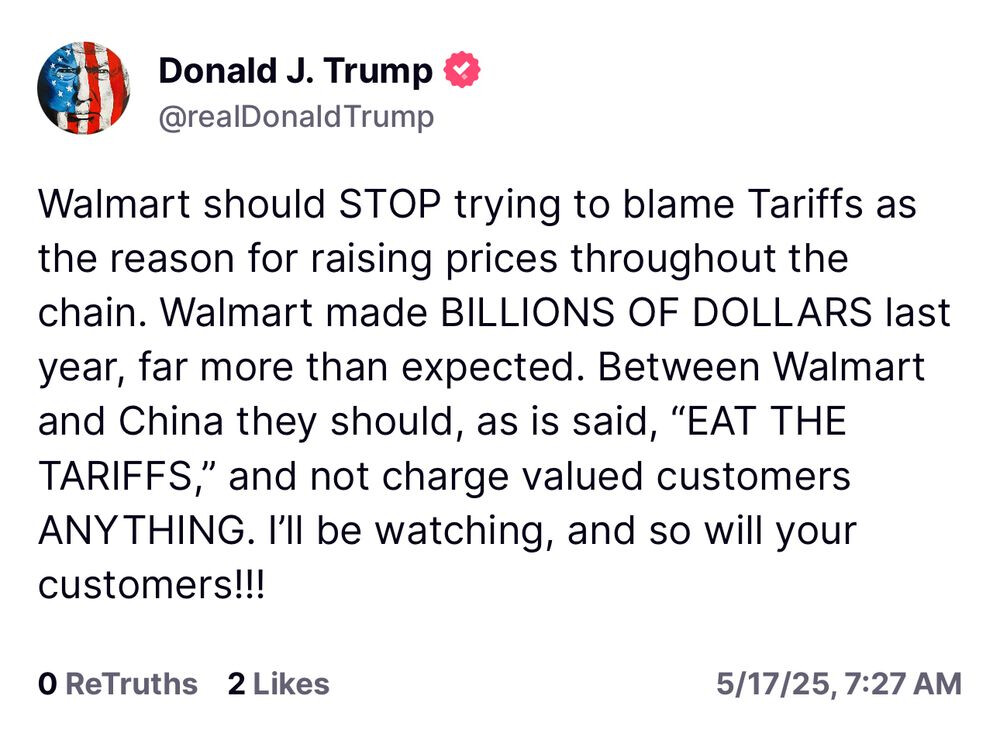 Trump thinks a TS post is going to intimidate Walmart? He should have issued an executive order.