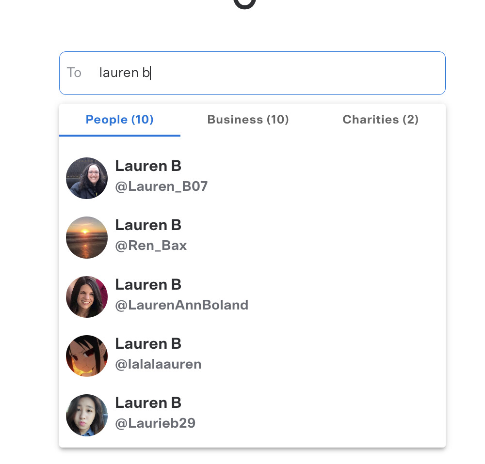 So I need to know her username, which of course isn’t displayed at first. Maybe I’ll just type @ so I can see a list of all usernames. No, that stops at 5. God forbid I see all 20 or so people I’ve ever paid on Venmo. Gotta think about performance. 5 is enough.