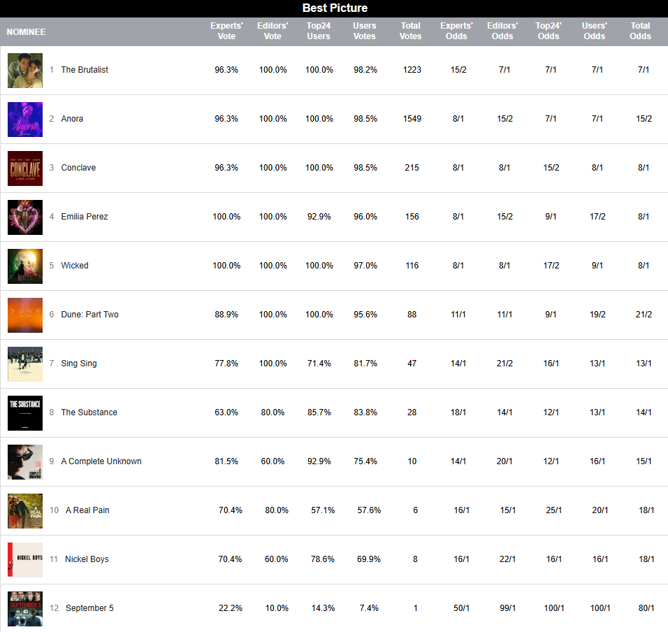 Again, I look forward to actually having an informed opinion about a potential Brutalist win. I am disheartened that Anora has maybe begun to slip.