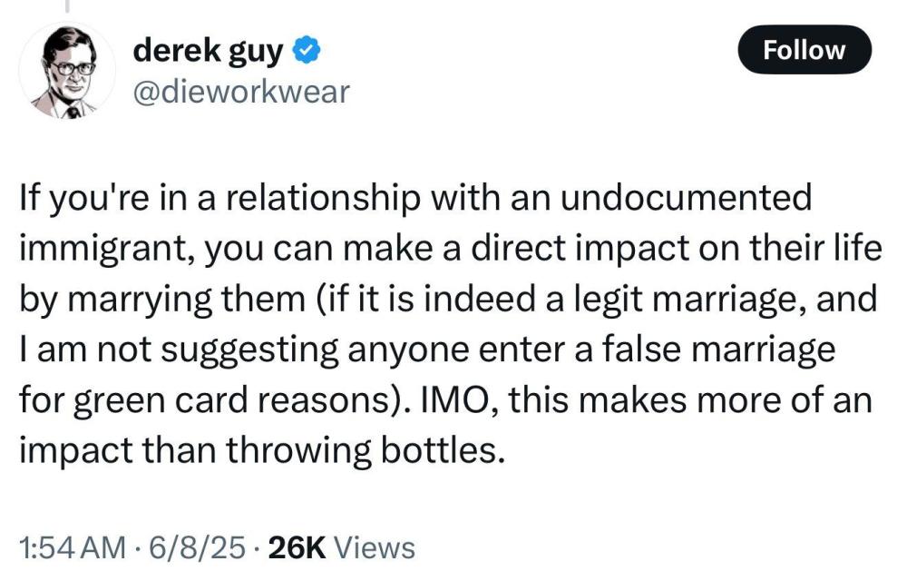 Like, it’s so dangerous that he’s afraid to even just say people should get married. No way he’s brave enough to advocate things like leaving water for people, helping people get social security numbers and employment, helping undocumented people get housing, etc.